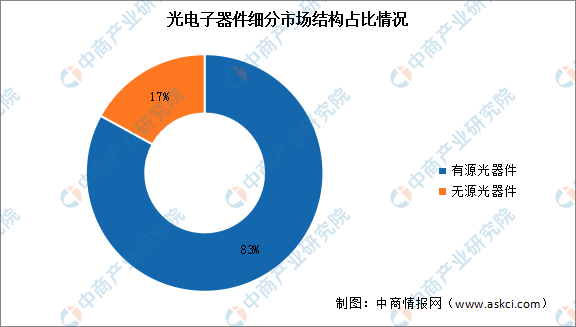 光电子器件按照是否需要外部能源来工作,可分为有源光器件和无源光器件两类。目前,光电子器件主要为有源光器件,占比达83%,主要用于光电转换或光信号处理,包括激光器、光探测器、光放大器、光开关、光调制器、光显示器件等;无源光器件占比较小,约17%,包括光纤连接器、耦合器、波分复用器、光隔离器、光衰减器、光分路器、光滤波器等。