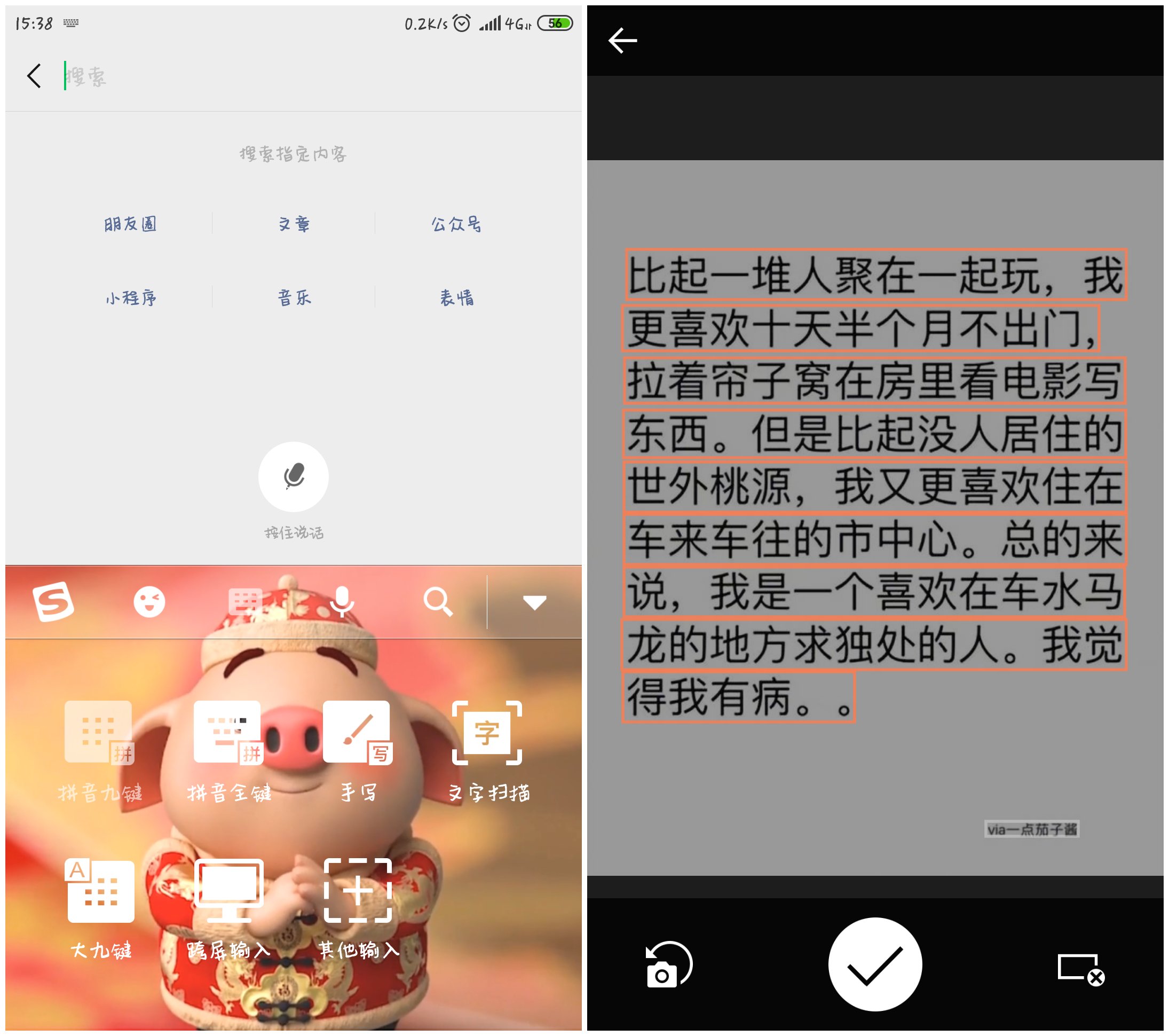 还有一个,就是很多人都在使用的【搜狗输入法】 ,搜狗输入法中的小键盘,有一个叫【文字扫描】的功能,用它进行文字识别可以选择指定的识别区域进行识别,很方便~