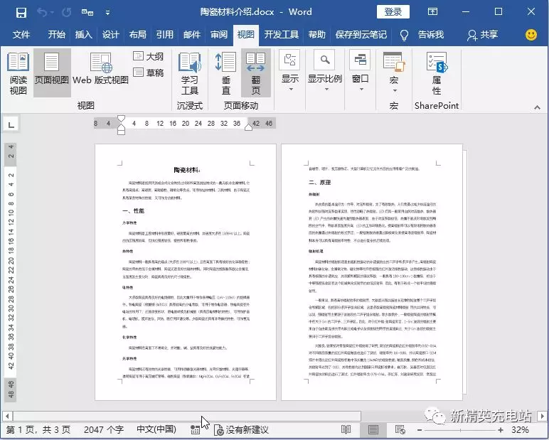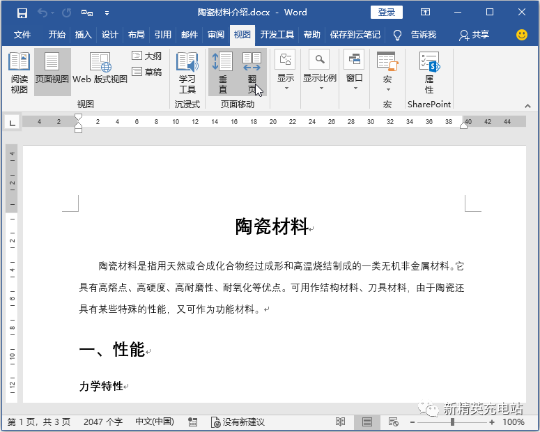 Step 01 进入横向翻页状态。打开素材文件“陶瓷材料介绍 .docx”文档,单击【视图】选项卡下【页面移动】组中的【翻页】按钮,如下图所示。