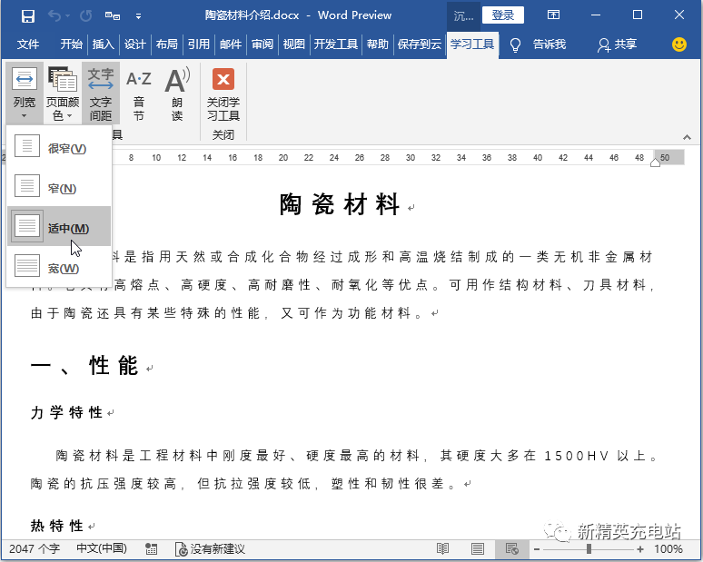 Step 02 调整列宽参数。进入沉浸式阅读状态后,可以进行阅读参数调整。单击【沉浸式-学习工具】选项卡下的【列宽】按钮,选择【适中】列宽模式,如下图所示。