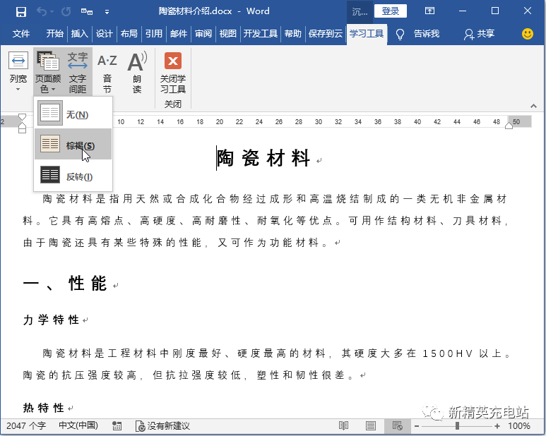 Step 03 调整页面颜色。单击【沉浸式-学习工具】选项卡下的【页面颜色】按钮,选择【棕褐】选项,如下图所示。