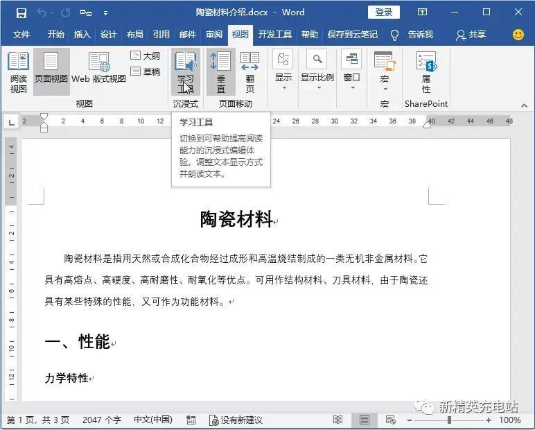 Step 01 进入沉浸式学习状态。打开素材文件“陶瓷材料介绍 .docx”文档,单击【视图】选项卡下【沉浸式】组中的【学习工具】按钮,如下图所示。