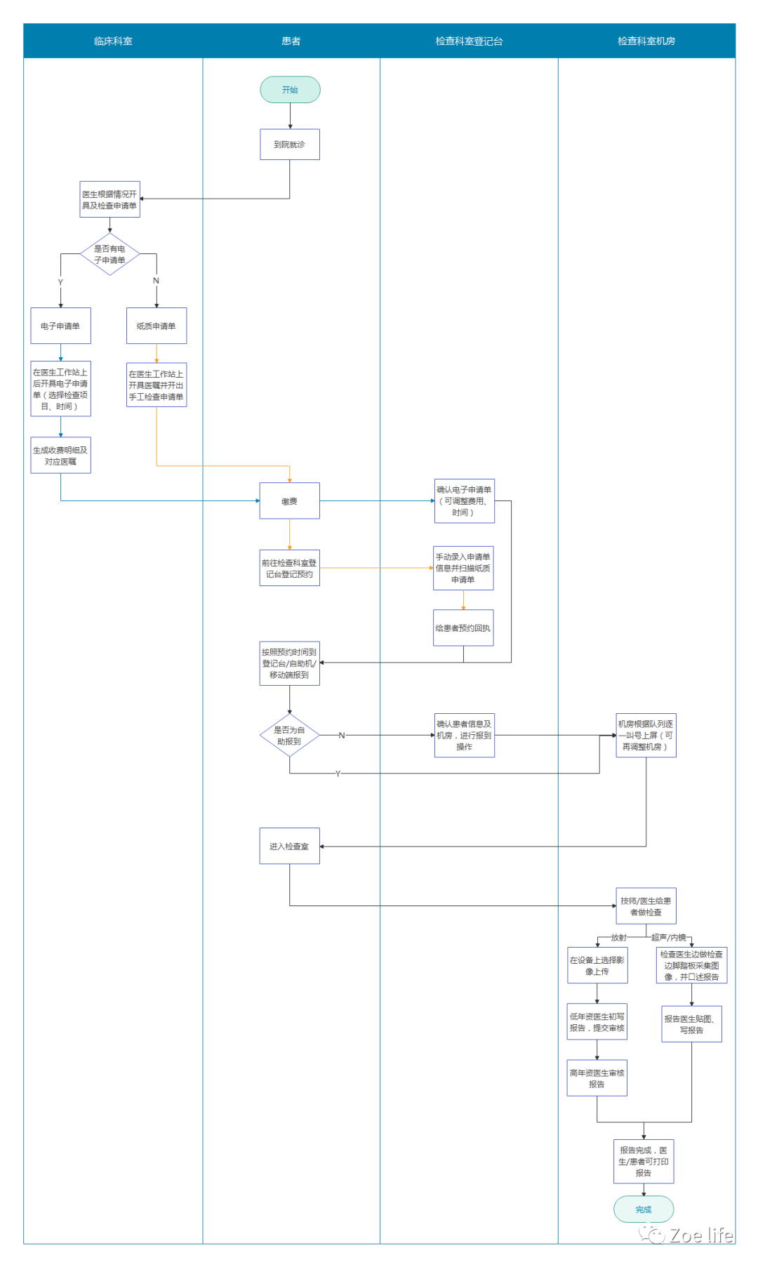 以上主要为门诊流程 ,住院/急诊/体检的检查流程与门诊的不同点(电子申请单)如下: