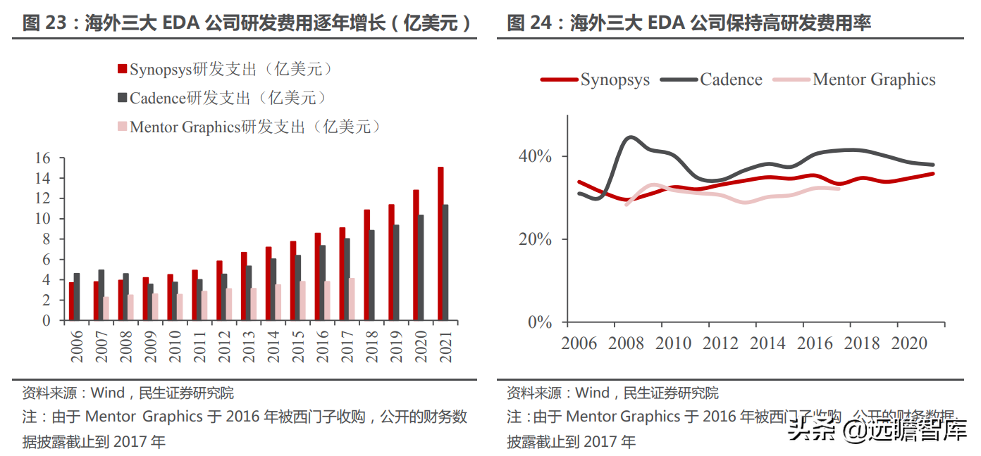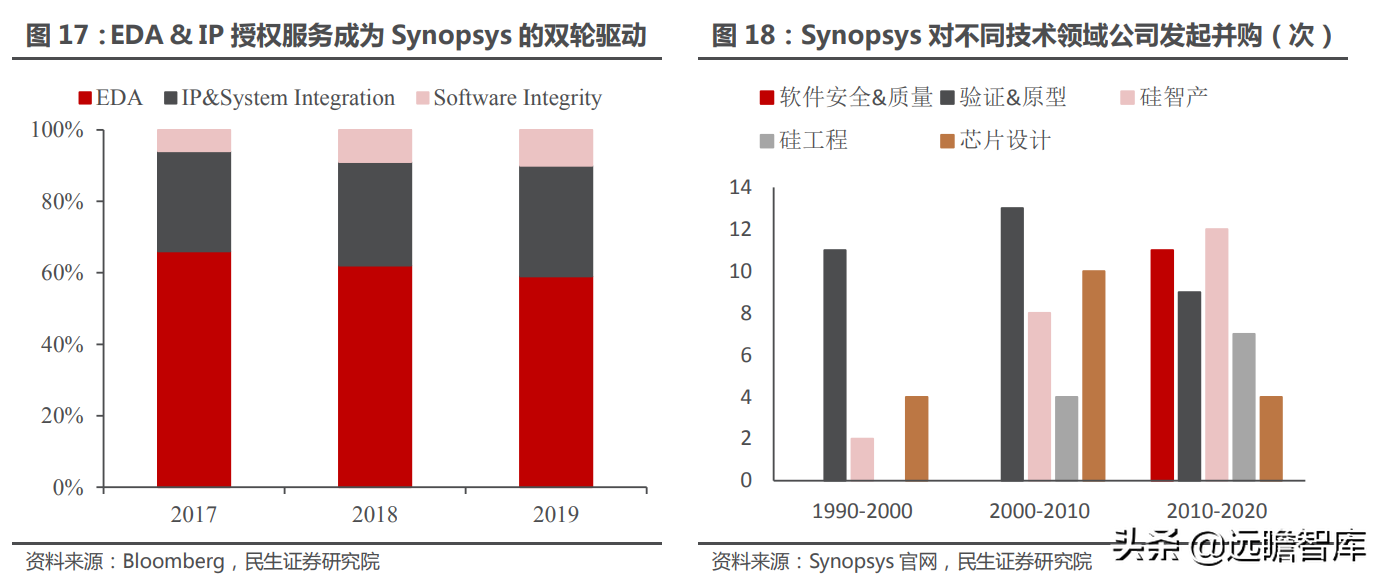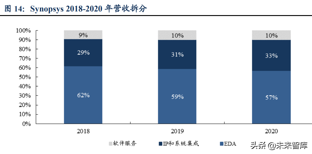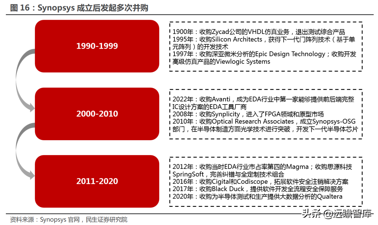 Synopsys 通过并购超越 Cadence,铸就全球 EDA 龙头地位。纵观 Synopsys 的发展 历史,不仅通过大量的并购完善了公司业务,实现了全流程覆盖,同时也通过数次关键 并购从而直接在与剩余两大巨头的竞争中脱颖而出,成为全球 EDA 龙头。根据芯思想 数据,2002 年,Synopsys 以 8.3 亿美元收购与 Cadence 结束专利诉讼的 Avanti,从而成 为 EDA 历史上第一家可以提供顶级前后端完整 IC 设计方案的领先 EDA 工具商。这场 收购改变了传统上“Synopsys 占前端,Cadence 占后端”的格局,让 Synopsys 在进入到 后摩尔定律时代之前完成基石技术的布局。(报告来源:未来智库)
