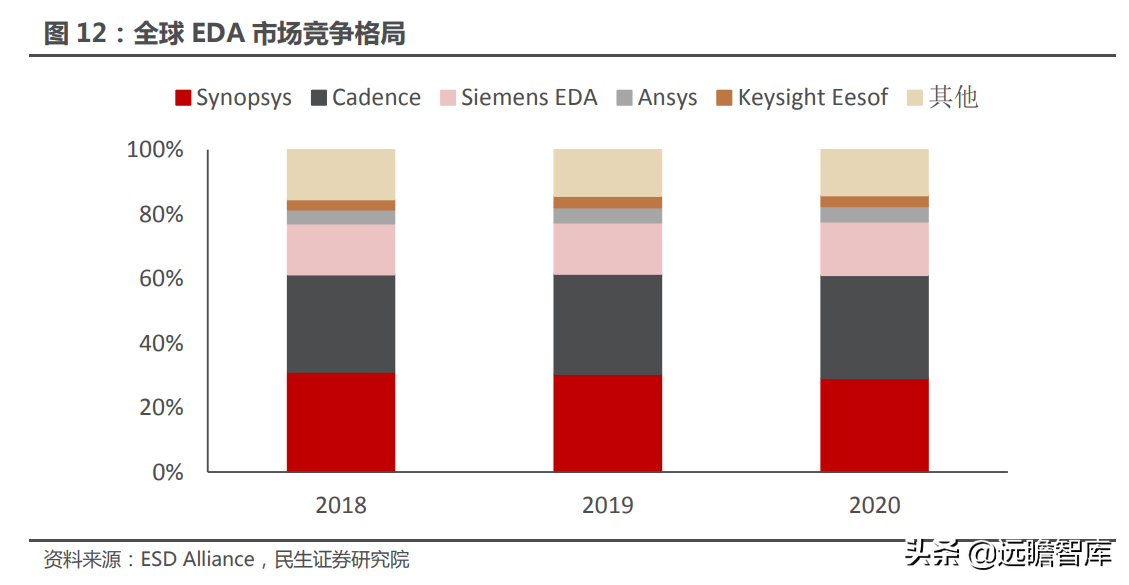 三大巨头垄断全球 EDA 市场。根据 ESD Alliance 和前瞻产业研究院数据,新思科 技(Synopsys)、楷登电子(Cadence)与西门子 EDA(2016 年收购的 Mentor Graphics) 三大寡头 2020 年全球 EDA 市场营收份额占比约为 70%。三大巨头是全球仅有的拥有设 计全流程 EDA 工具解决方案的企业,其他企业缺少布局设计全流程工具技术的实力。