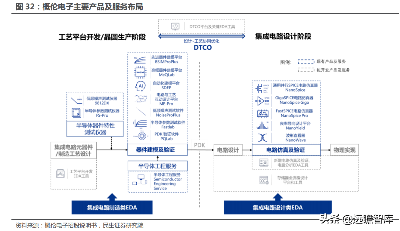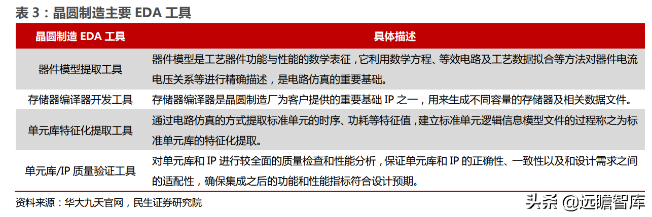 (1)公司制造类 EDA 工具主要为器件建模及验证 EDA 工具、PDK 生成及验证 EDA 工 具、标准单元库设计及验证 EDA 工具等,用于快速准确地建立半导体器件模型、PDK 和标准单元库,是集成电路制造领域的核心关键工具。