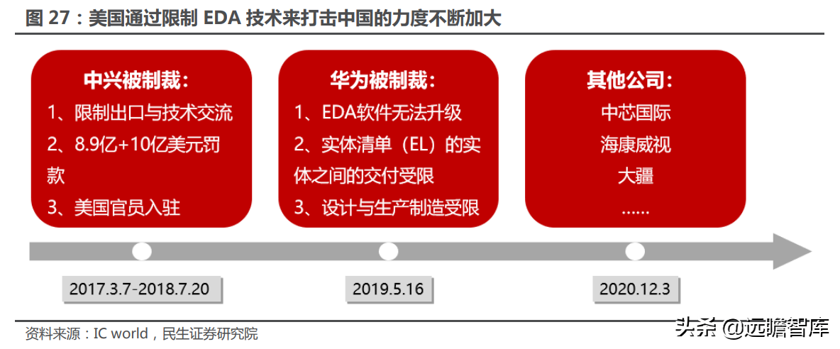中美科技脱钩,趋势愈演愈烈。美国不仅绕开世界贸易组织,直接对正在崛起的中 国施加额外贸易关税,而且在科技领域也针对“中国制造 2025”等采取一系列限制措施, 华为、中兴通讯等均位列制裁名单。2019 年 5 月 16 日,美国商务部宣布将华为及 70 家 关联企业列入所谓的“实体清单”。如果没有美国政府的批准,华为将无法向美国企业购买元器件。受此影响,多家国外供应商开始对华为实行“断供”。美国对中国的压力已经 由经贸领域全面上升到科技领域,高新技术成为双方争夺的焦点。EDA 作为“半导体皇 冠上的明珠”,必然受到美国限制,华为目前已经停止了与国际三大巨头的合作,自主研 发 EDA 已经势在必行。