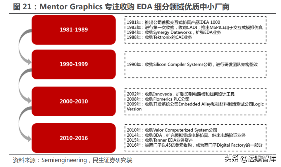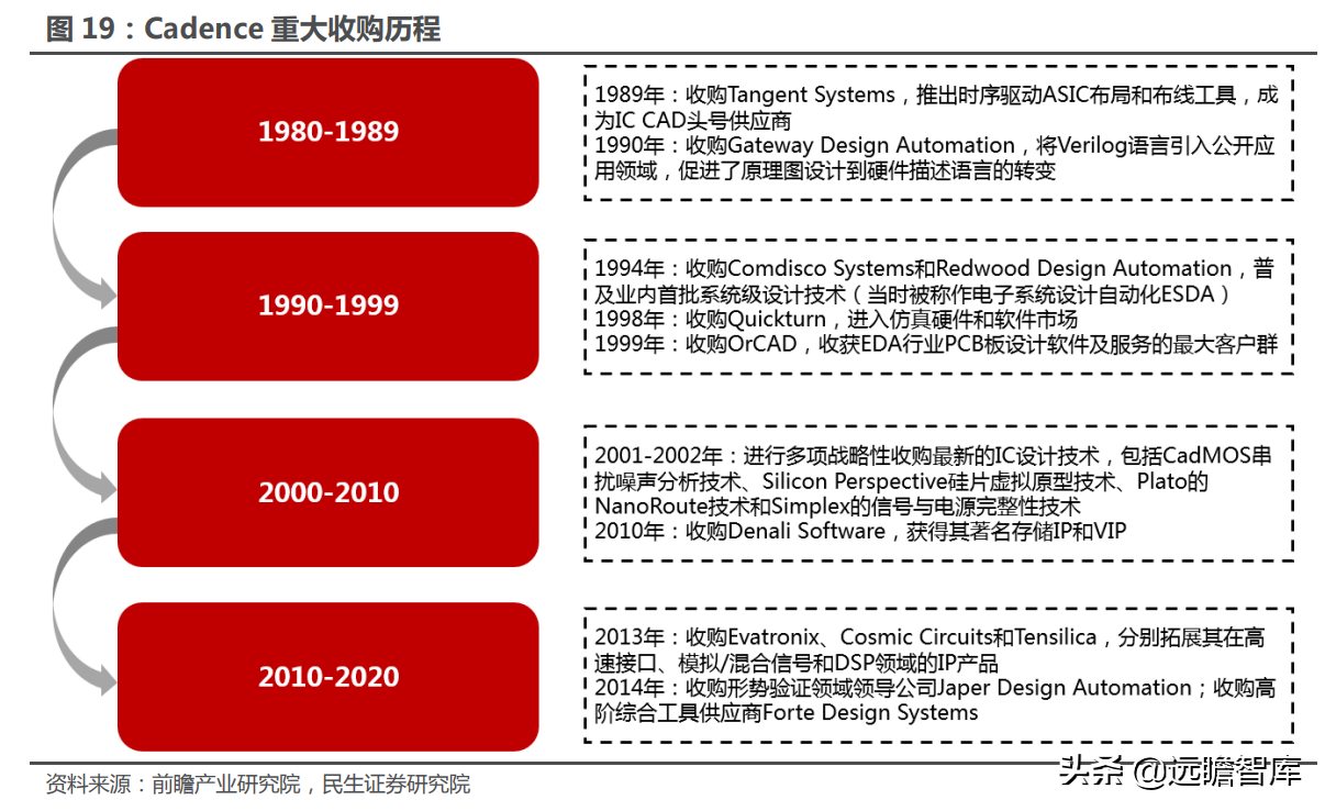 Cadence 通过并购成为一代霸主。Cadence 于 1989 年收购 Verilog 是其最为重要的 一次并购,通过这次并购 Cadence 成功解决了复杂度带来的芯片性能验证问题,也标志 着 EDA 从设计领域,拓展进入了软件模拟和硬件仿真领域,设计与仿真能够通过使用 同一家公司的不同套软件来完成。2001 年 Cadence 收购 Silicon Perspective,将 IC 布局 工具和 SI 分析工具收入囊中,为下一代布局布线做技术储备;2002 年收购 Simplex,补 足寄生参数提取和分析方面的能力;同年收购 IBM 硬件仿真业务,真正占领硬件仿真 高地。