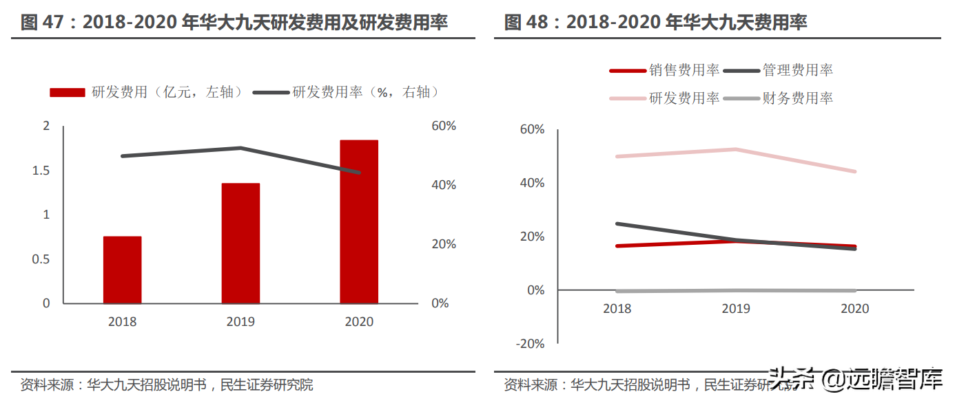 2018 至 2020 年,公司研发费用分别为 7509.81 万元、1.35 亿元和 1.83 亿元,复合增长率为 56.28%,研发费用占营业收入的比重分别为 49.81%、52.50%和 44.22%。2020 年研发费用占营业收入的比重略有下降,主要原因为前期公司的研发投入成效显著,2020 年营业收入的增幅超过研发费用增幅。