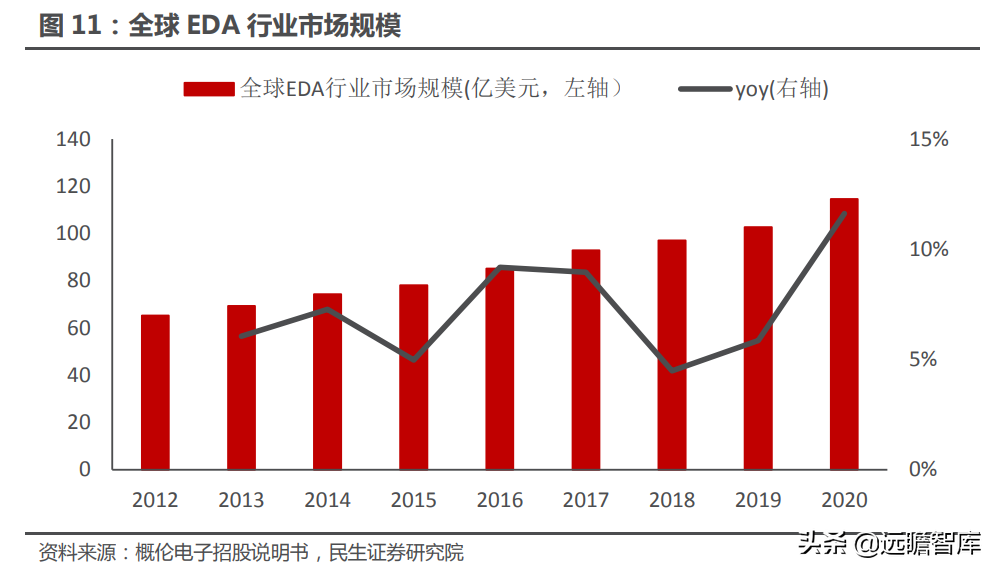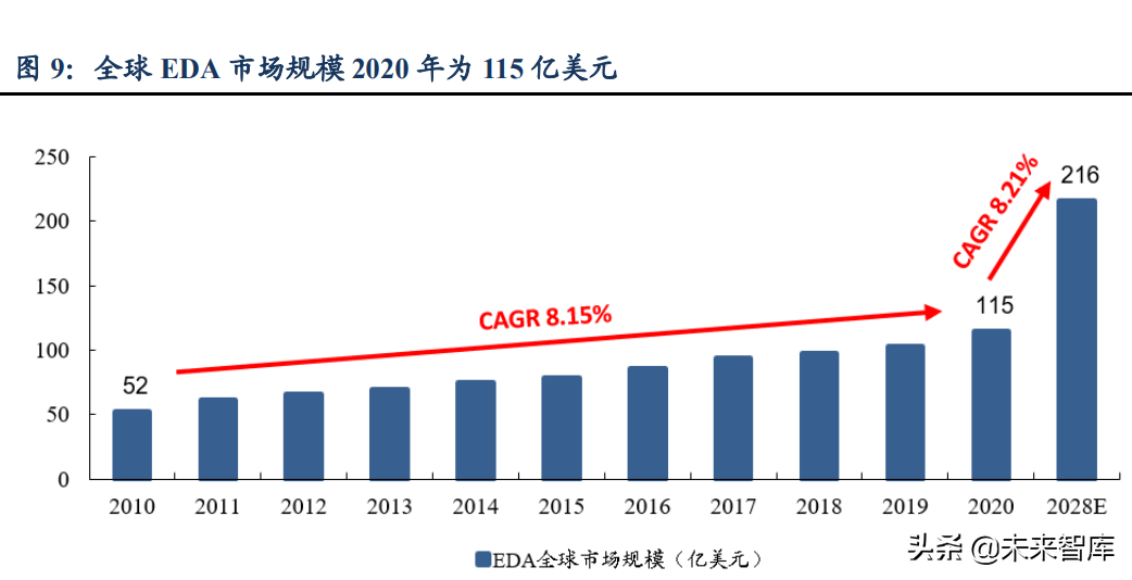 2020 年全球 EDA 市场规模为 115 亿美元,已经进入平稳发展期。根据 ESDAlliance 数据,2020 年全球 EDA 市场规模为 115 亿美元,2010-2020 年 10 年复合增速为 8%。 根据 Verified Market Research 数据,2028 年全球 EDA 市场规模有望达到 215.6 亿美元, 2020-2028 年 8 年复合增速为 8.21%。总体来看,全球 EDA 市场增速已经较为平稳。