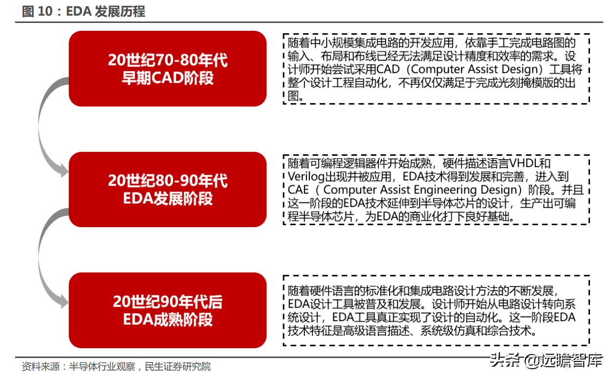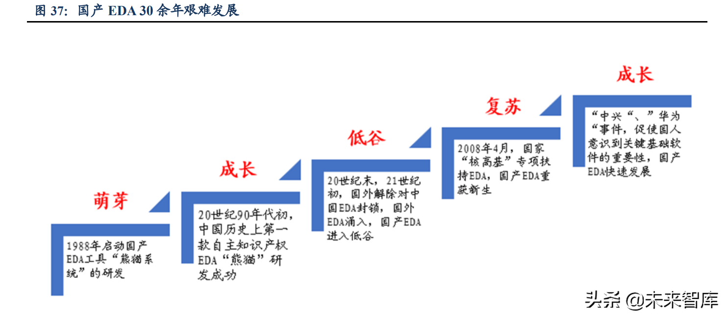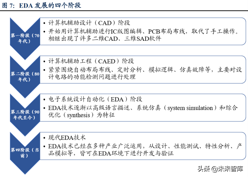 第四阶段:现代 EDA 时代。21 世纪以来,EDA 工具快速发展,并已贯穿集成电路 设计、制造、封测的全部环节。对于上亿乃至上百亿个晶体管规模的芯片设计,EDA 工 具保证了各阶段、各层次设计过程的准确性,降低了设计成本、缩短了设计周期、提高 了设计效率,是集成电路产业产能、性能进步的源头,EDA 工具的发展加速了集成电路 产业的技术革新。同时伴随着智能手机、4G/5G、物联网等技术的发展,射频 EDA 软件 迎来了发展的黄金阶段。(报告来源:未来智库)