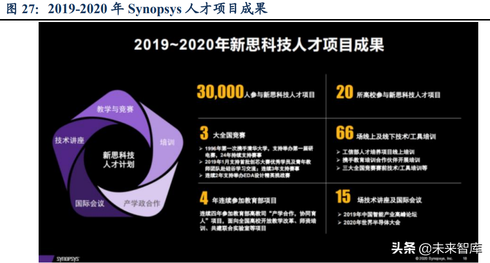 以新思科技为例,新思科技注重人才培养,其人才培养战略包括新思科技大学课程 体系、新思科技大学计划以及积极参与国家人才战略等方面。新思科技开发了一套集成 电路设计全套教程,包括 131 门本科及研究生课程、24 门训练课程、37 门讲座及实验, 适用于集成电路相关专业的大学本科和硕士研究生。从EDA人才培养成果上看,仅2019- 2020 年这一年时间内,已有 30000 人参与到了新思科技人才项目当中,20 所国内高校 与新思科技建立了人才培养相关合作。