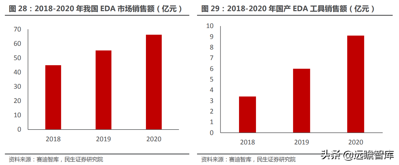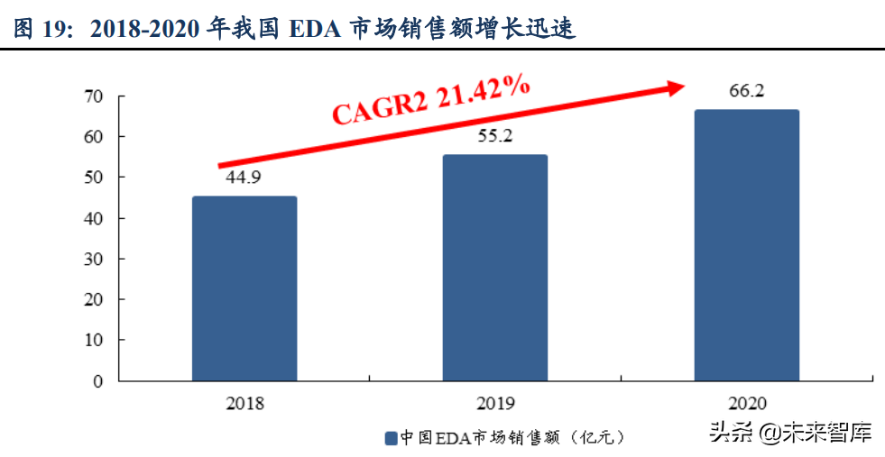 与国际市场相比,中国 EDA 市场规模增速更快。根据赛迪智库数据,2018 年,我 国 EDA 市场总销售额为 44.9 亿元,而到 2020 年我国 EDA 市场销售额已经达到 66.2 亿 元,2 年复合增速为 21.42%,远高于全球市场营收规模 2018-2020 年 2 年 9%的复合增 速。