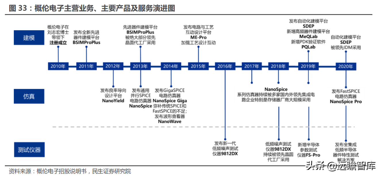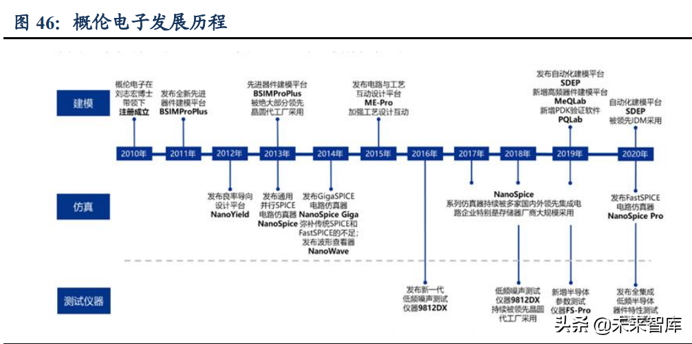 十年一剑,“DTCO”产品技术世界领先。概伦电子是提供大规模高精度集成电路仿 真、高端半导体器件建模、半导体参数测试解决方案的厂商,致力于推动先进工艺开发 和高端芯片设计的深度联动。公司成立于 2010 年,创始人曾任 Cadence 全球副总裁。 历经 2010-2020 年,公司实现了 DTCO(设计工艺协同优化)真正落地的从数据到仿真 的创新 EDA 解决方案,得到了业界的认可。公司于 2019 年底并购北京博达微科技,增 强了业务实力,为公司持续进行并购提供了范本。