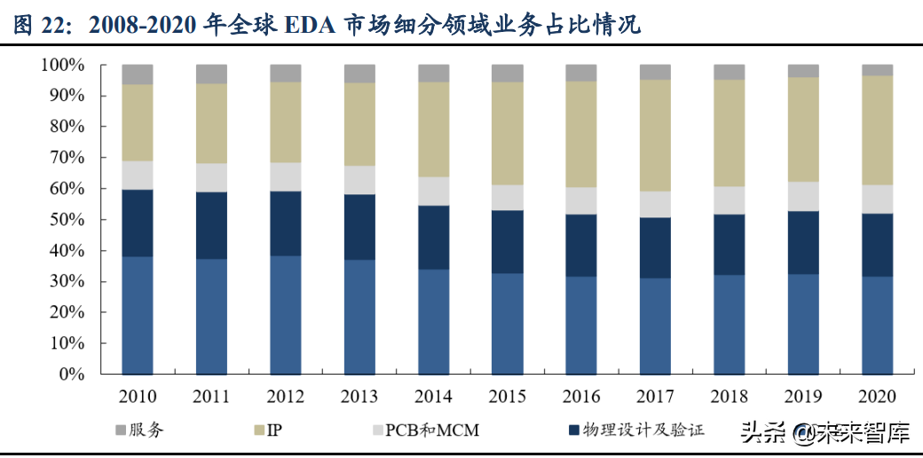 计算机辅助工程(CAE)和 IP 为 EDA 市场业务主要构成部分。EDA 市场业务主 要可以细分为计算机辅助工程(CAE)、IC 物理设计及验证、PCB 与多芯片模块以及半 导体 IP 核等。根据 ESD Alliance 数据,从细分领域看,EDA 各细分领域营收占比基本 保持稳定,2020 年占据市场规模较大的部分为 CAE 与 IP,两者合计占比达到近 67%。 其中 CAE(Computer Aided Engineering)主要包括电子系统级设计及综合验证、设计输 入、逻辑验证、模拟和混合信号模拟器、形式验证、时序/仿真分析以及测试/测试自动化设计。IP(Intellectual Property Core)是芯片设计图中具有独立功能电路模块的成熟设计。 设计师可以把成熟的 IP 模块设计应用于多个复杂的芯片的电路设计图中,能避免复杂 和重复的设计工作,缩短设计周期,提高芯片设计的成功率。IP 业务从 2010 年开始在 EDA 市场营收占比开始不断增长,到 2020 年已经达到 35.22%,成为了营收占比最大的 业务领域。