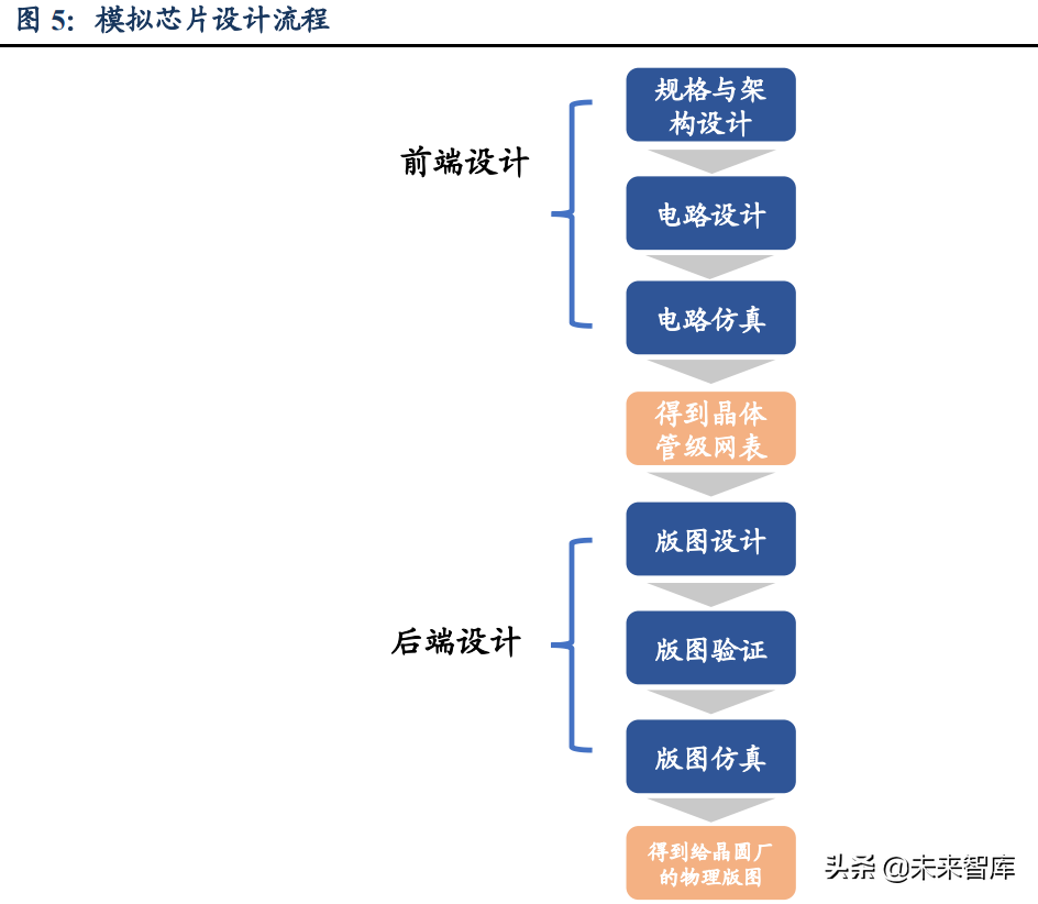 从设计步骤上芯片设计分为前端设计和后端设计。前端设计和后端设计并没有统一 严格的界限,根据具体公司和产品会略有不同。一般来讲用设计的电路实现想法就是前 端设计;将设计的电路制造出来,在工艺上实现想法就是后端设计。这就好比修盖房屋, 建筑设计图就属于前端设计,设计出房子的外部造型和内部结构;建筑施工图属于后端 设计,细化到建筑施工的步骤、方法和材料的用量、选择。