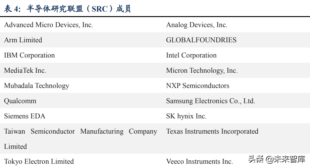 半导体研究联盟促进企业集中技术创新。除 NSF 外,半导体研究联盟(SRC)也为 美国 EDA 行业的发展提供了帮助。SRC 是世界领先的大学半导体和相关技术研究联盟, 是推动美国半导体共性技术发展的关键性力量。其行业合作伙伴包括应用材料公司 AM、 格罗方德 GLOBALFOUNDRIES、IBM、英特尔公司、美光科技公司、雷神公司、德州 仪器公司和联合技术公司。SRC 在整合行业资源、专注于共性的“竞争前”领域起到了 关键作用,各家 EDA 企业通过 SRC 将研究资金聚集起来集中力量进行产业共性技术创 新。