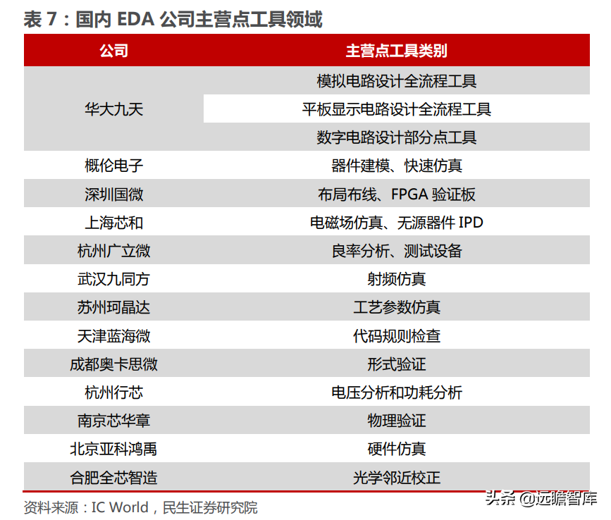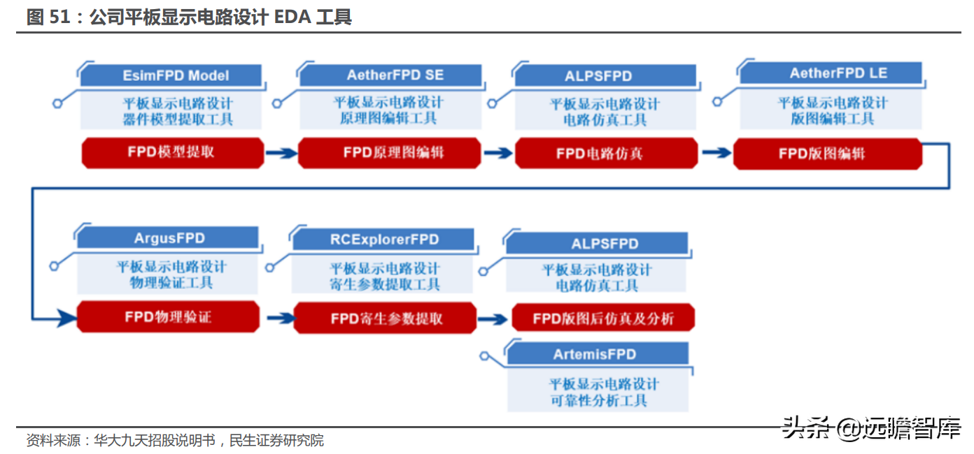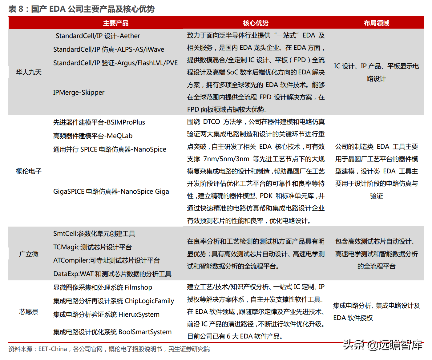 (2)华大九天是国内的 EDA 龙头企业,提供数模混合/全定制 IC 设计、平板(FPD)全流程设计及高端 SoC 数字后端优化方向的 EDA 解决方案,是全球唯一可提供液晶平板全流程 EDA 设计解决方案的提供商。