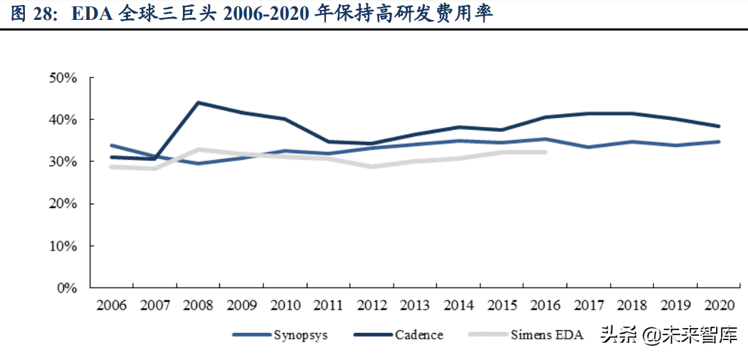 持续研发是 EDA 发展的动力。EDA 软件是算法密集型的大型工业软件系统,EDA 开发需要涉及到计算机、物理、数学等多方面知识。芯片设计更迭速度不断加快,EDA 软件公司需要不断加大研发投入,确保自己技术领先。同时,EDA 巨头们正是凭借大量 的知识产权保持领先地位。全球三大巨头垄断的格局在 2000 年后就较为稳定,2010-2020 年三大巨头营收年复合增速都接近 10%,但仍然保持着 30%-40%的研发费用率,个别年 份超过 40%。2020 年,Synopsys 和 Cadence 的研发费用分别高达 13 亿和 10 亿美元, 几乎是 2020 年中国 EDA 市场销售规模的两倍。