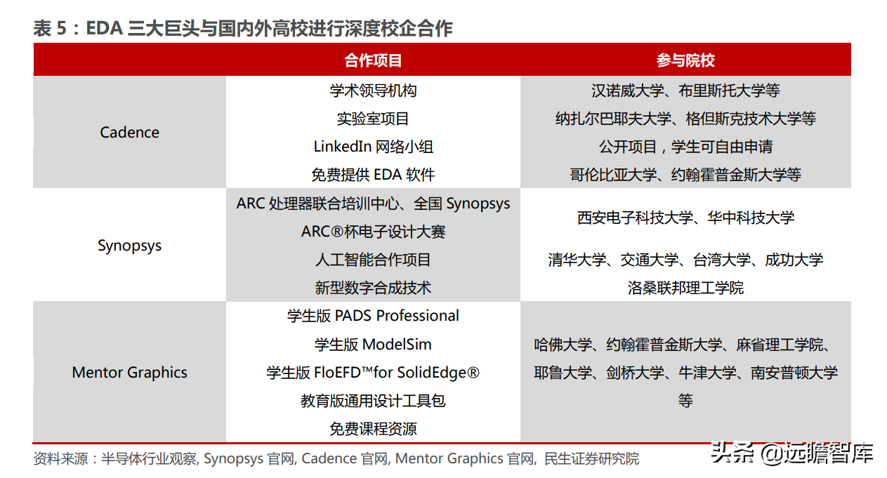 我国 EDA 储备人才培养体系不够完善。海外 EDA 培养体系较为成熟,2015 年, 美国 SRC 公布了 STARnet 计划,计划在五年内向六个大学研究中心投资 1.94 亿美元, 其中多个项目直接与 EDA 相关。Synopsys 进入中国以来,已经与清华大学、东南大学、 华中科技大学等知名高校合作,为其提供软件支持,成立合作交流中心。我国目前仅有 少数院校拥有 EDA 方向的研究和人才培养计划,国产 EDA 公司与高校的合作也是刚刚 开始,人才培养体系还不够完善。