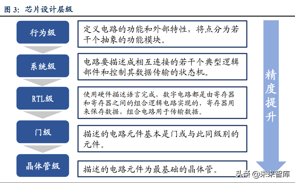 从设计维度上芯片设计可以分为五个层级。设计类 EDA 工具根据设计方法学的不 同,按照设计层级自上而下,可进一步细分为行为级、系统级、RTL 级、门级、晶体管 级 EDA 工具。各层级 EDA 工具的仿真和验证精度依次提升、速度依次降低,其拟实现 的目标和应用场景也有所不同。例如高层级的系统和行为级仿真和验证主要适用于产品 设计早期的原型验证,评估产品原型的性能和功能;最底层的晶体管级仿真和验证则主 要决定了最终产品的性能和良率。针对于大规模集成电路,设计方法往往从系统和行为 级设计开始,逐层设计、仿真、验证和实现,并输出可以交付制造的晶体管级版图信息。