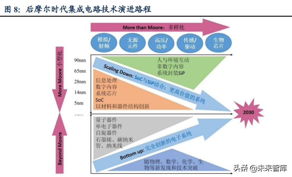 后摩尔时代技术演进驱动 EDA 技术应用延伸拓展。后摩尔时代的集成电路技术演 进方向主要包括延续摩尔定律、扩展摩尔定律以及超越摩尔定律三类,主要发展目标涵 盖了建立在摩尔定律基础上的生产工艺特征尺寸的进一步微缩、以增加系统集成的多重 功能为目标的芯片功能多样化发展,以及通过三维封装、系统级封装等方式实现器件功 能的融合和产品的多样化。其中,面向延续摩尔定律方向,单芯片的集成规模呈现爆发 性增长,为 EDA 工具的设计效率提出了更高的要求。面向扩展摩尔定律方向,伴随逻 辑、模拟、存储等功能被叠加到同一芯片,EDA 工具需具备对复杂功能设计的更强支撑 能力。面向超越摩尔定律方向,新工艺、新材料、新器件等的应用要求 EDA 工具的发 展在仿真、验证等关键环节实现方法学的创新。
