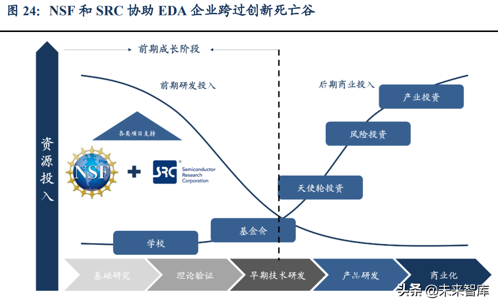 NSF 与 SRC 相互合作帮助企业渡过初期难关。NSF 资助的 EDA 研究项目主要为 刚刚起步、较为初期的阶段,在项目技术成熟度逐渐提高后,SRC 成为了接棒者,继续 给予支持。EDA 是技术密集型行业,前期需要大量的研发投入,商业回报较小,需要像 NSF、SRC 这样的政府机构给予支持。