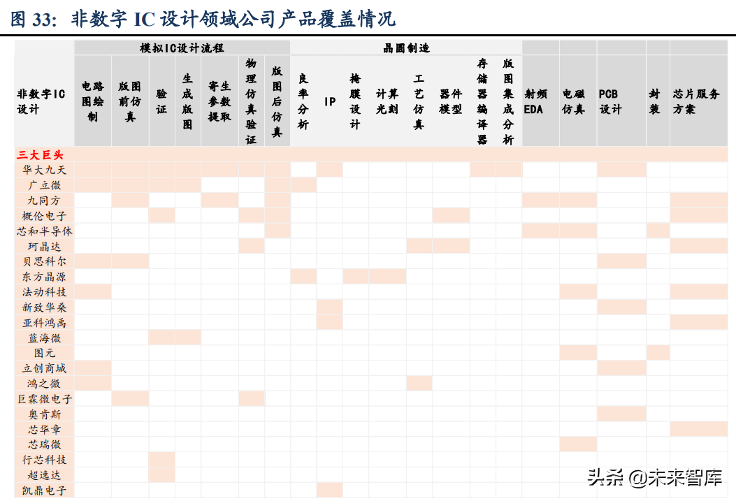 海外 EDA 产品矩阵更全。从 EDA 产品矩阵的完整度来看,根据我们测算,EDA 工 具链大约有 40 个细分领域,国内厂商尚未如国际三大家一样实现 EDA 全流程、全细分 领域的覆盖。截至 2021 年 12 月,国产 EDA 龙头华大九天,也仅能够实现模拟芯片设 计和平板设计全流程覆盖,覆盖率约为 40%,其他国产 EDA 厂商产品多为点工具,尚 不能为客户提供特定领域全流程产品服务。