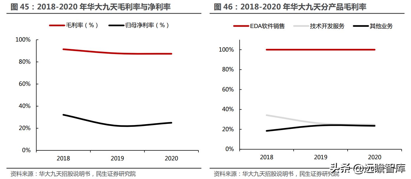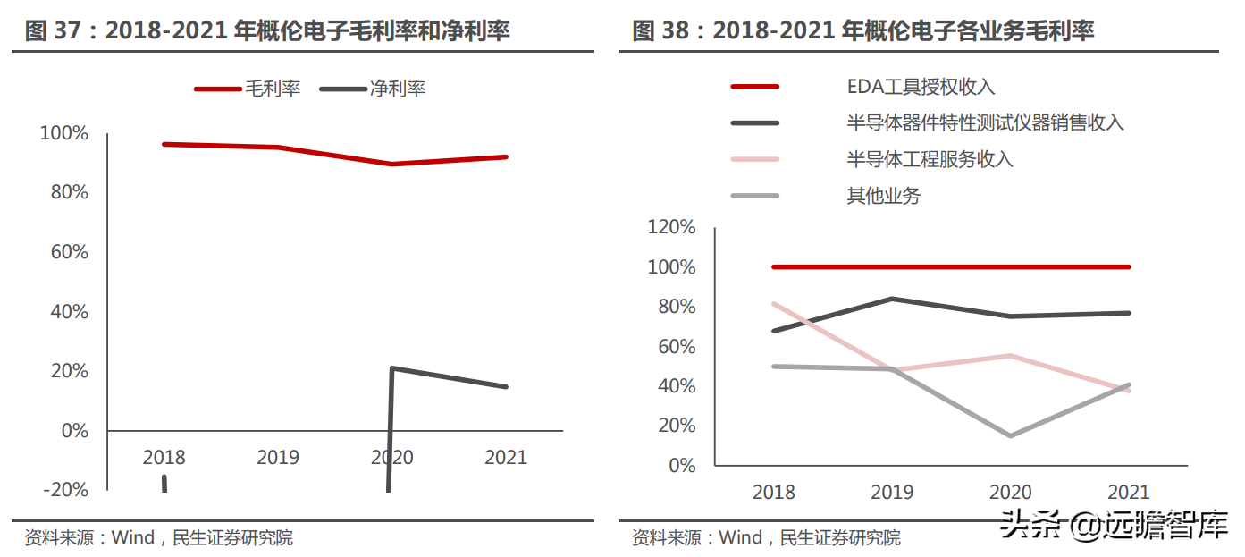 公司毛利率始终保持较高水平。 2018-2021 年,公司毛利率分别为 96.28%、95.29%、89.54%、91.96%,其中 EDA 工具授权毛利率始终为 100%,半导体器件特性测试仪器毛利率分别为 67.82%、84.12%、75.19%、76.86%,半导体工程服务毛利率分别为 81.56%、48.05%、55.42%、37.77%。2021 年毛利率同比上升 2.42%,主要原因系 EDA 工具授权业务占主营业务收入的比例从 2020 年的 69.23%提升至 2021 年的 72.86%。