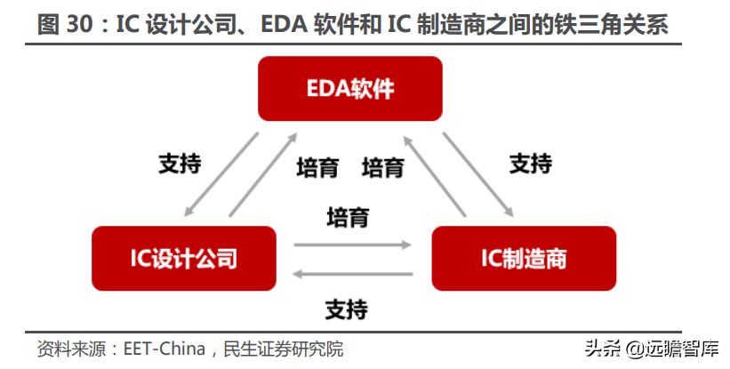 产业链协同是 EDA 发展的保障。芯片设计的先进工艺是由晶圆厂、设计公司和 EDA 软件厂商共同推进的成果。晶圆厂从材料、化学、工艺过程等制造步骤来寻求工艺突破; EDA 公司借助晶圆厂的测试数据和工艺细节文件来改进 EDA 软件;芯片设计公司使用 新的 EDA 模型进行设计、试生产,反馈到晶圆厂和 EDA 公司改善制造工艺和软件模 型。晶圆厂、EDA 软件公司、设计公司相辅相成,互相合作,共同推进技术进步。
