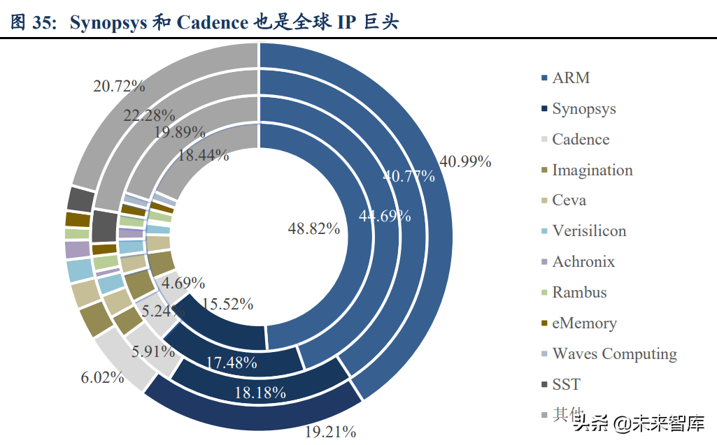 IP 已经成为海外 EDA 公司的重要收入,但国产 EDA 公司尚未大规模布局。EDA 三巨头中的 Synopsys 和 Cadence 同样也是 IP 市场的巨头,Synopsys 和 Cadence IP 市场 营收规模占有率为全球第二和第三,仅次于 ARM。相比之下,国产 EDA 厂商大多还在 研制 EDA 工具,未布局 IP 产品。随着集成电路产业的不断发展,IP 的作用会愈发显著, 国内外的 EDA 公司在 IP 的发展上已经产生了较大差距。