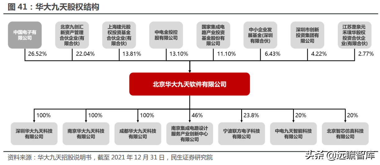 唯一国家队,中国电子给予华大九天强产业链支持。华大九天第一大股东中国电子 信息产业集团有限公司(简称:中国电子,CEC)是中央直接管理的国有重要骨干企业。 CEC 成功突破高端通用芯片、操作系统等关键核心技术,构建了兼容移动生态、与国际 主流架构比肩的安全先进绿色的“PKS”自主计算体系。根据 CEC 官网数据,截至 2020 年底,中国电子拥有 26 家二级企业、15 家上市公司、18 余万员工,实现全年营业收入 2479.2 亿元。CEC 旗下半导体企业众多,如飞腾、成都华微电子、澜起科技、中国振华 等,为华大九天产品的技术迭代和生态建设甚至是收购兼并提供了强有力的产业链支持。 第二大股东大基金一期二期对半导体产业链从原材料到封装测试进行了全面投资,能够 为华大九天的产品提供全产业链支持。