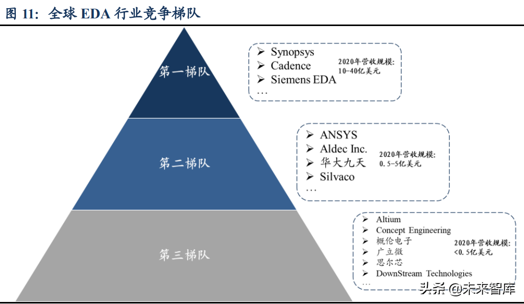 全球 EDA 企业按照业务水平可以大致分为三个梯队。第一梯队由 Synopsys、 Cadence、Siemens EDA 三家国际知名 EDA 企业组成。该类企业业务遍布全球,科研实 力雄厚,有全流程 EDA 产品,在部分领域处于领先地位,2020 年收入规模达到 10-40 亿美元。第二梯队以 ANSYS、Silvaco、Aldec Inc.、华大九天等为代表,该类企业拥有 特定领域全流程 EDA 产品,在局部领域技术较为领先,2020 年收入规模处于 0.5-5 亿 美元区间。第三梯队以 Altium、Concept Engineering、概伦电子、广立微、思尔芯、 DownStream Technologies 等为代表,该类企业在 EDA 上的布局主要以点工具为主,缺 少 EDA 特定领域全流程产品,2020 年收入规模低于 0.5 亿美元。
