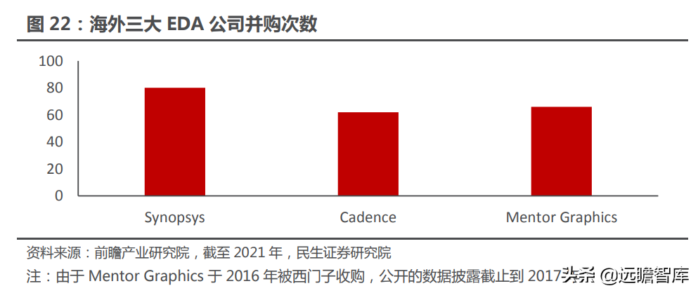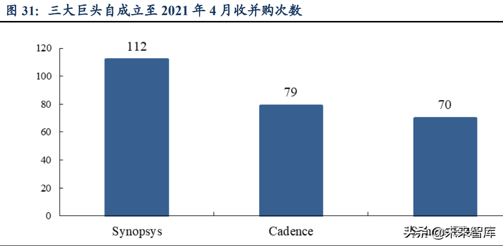 并购是 EDA 企业成长的最佳选择。全球三大巨头的成长史就是一部并购史,其中 全球 EDA 巨头 Synopsys 自 1986 年成立至 2021 年 4 月,共完成 112 起收并购案。并购 在 EDA 行业如此兴盛的原因有:
