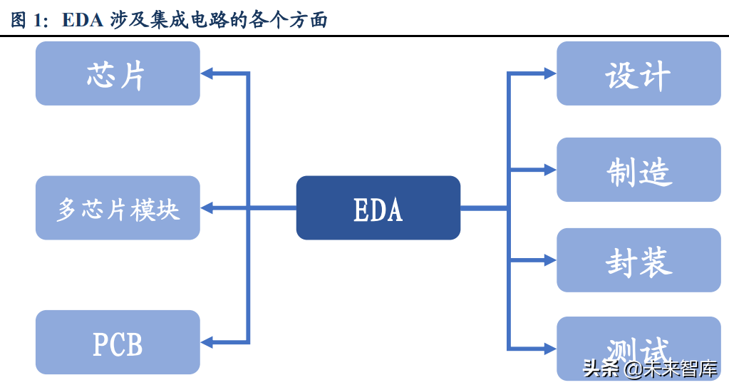 EDA 几乎涉及集成电路的各个方面。在设计生产流程方面,EDA 被应用在芯片系 统的设计、制造、封装、测试全流程,涉及给芯片设计公司使用的设计类软件和给晶圆 厂使用的晶圆制造软件等。从电子系统层级上看,EDA 包括芯片、多芯片模块和印制电 路(PCB)板多个层级。