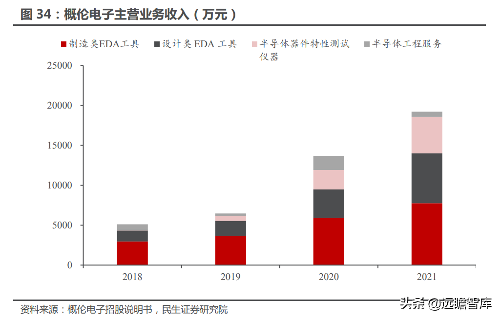 公司主营业务收入大部分为 EDA 工具授权收入,其他部分为相关的半导体器件特性测试仪器销售及半导体工程服务收入,2018-2021 年制造类 EDA 工具营收分别为 0.30、0.37、0.59、0.78 亿元;设计类 EDA 工具营收分别为 0.14、0.19、0.36、0.62 亿元;半导体器件特性测试仪器营收分别为 69、588、2443、4571 万元;半导体工程服务营收分别为 714、336、1772、645 万元。