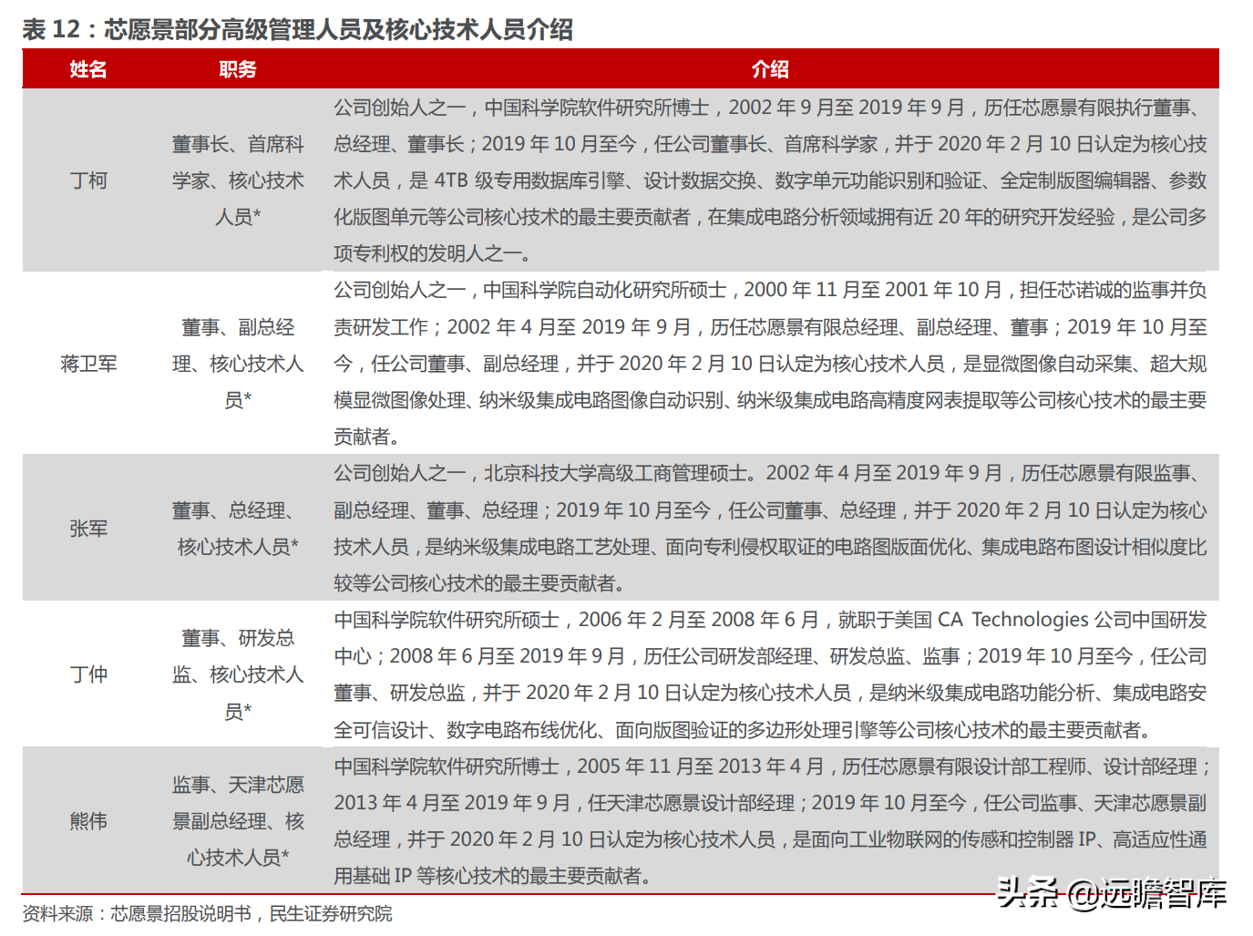 创始人与管理层在集成电路领域具有深厚的资源和技术背景。 公司创始人、董事长丁柯,为中国科学院软件研究所博士,曾参与国家自然科学基金重点项目、国家 973 基金等项目的研究工作,在中国计算机领域的权威性学术刊物《计算机学报》等核心期刊和国际学术会议上发表多篇论文,在集成电路分析领域拥有近 20 年的研究开发经验,规划建立了芯愿景 IC 分析服务、IC 设计服务和 EDA 软件开发的完整技术研发及业务体系,是公司总体技术路线的核心制定者。创始人蒋卫军,为中国科学院自动化研究所硕士,主要研究集成电路图像自动化处理技术,是模式识别和图像处理方面的资深专家。其余管理层成员也具有深厚的技术研发背景,长期扎根于集成电路领域。