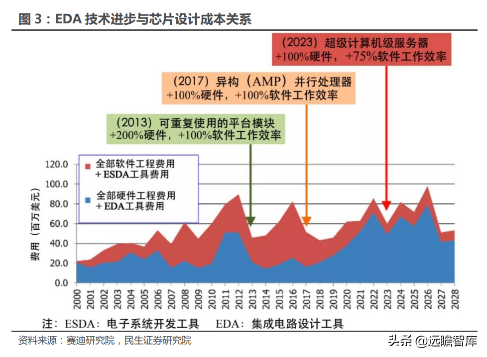 后摩尔时代系统设计是 EDA 技术变化方向。在原有摩尔定律定义下,芯片性能提 升主要来自工艺和架构,但工艺制程提升接近极限,摩尔定律显著放缓。在此背景下, 汽车、人工智能等领域的大型公司都开始定制自己的片上新系统,将其认定为自己差异 化竞争的关键因素。因此,对于 EDA 厂商来说,把定位从芯片设计转换到基于软硬件 协同的系统级设计是未来重要发展方向。