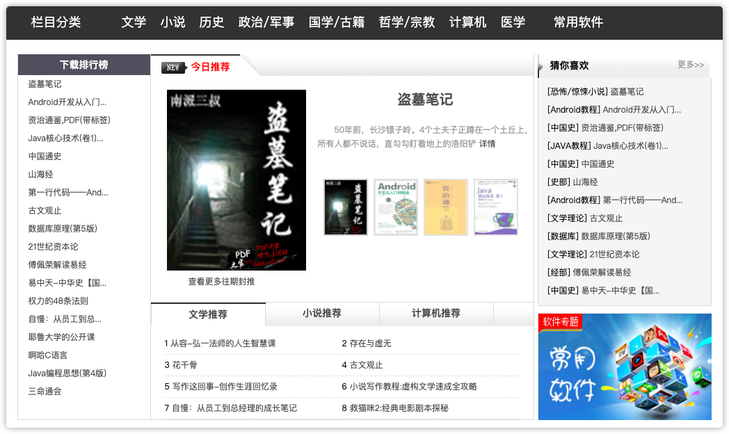 PDF之家这个网站主要分享PDF和TXT格式的书籍,网页设计一般,但是里面的书籍质量还是很高,网站涉及的书籍类型有文学,小说,军事,国学,古籍,哲学,计算机,医学等类型,存储方式是网盘分享。