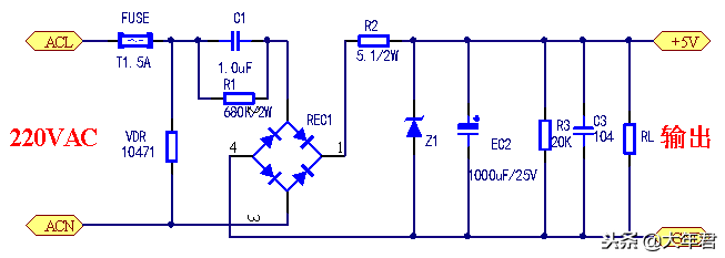 如下图是阻容降压电路图,当负载RL电流增大时,电阻R2上的压降增大,负载电压随之降低,但是,只要稳压管两点电压稍有下降,稳压管电流就会显著减小,使通过电阻R2的电流和电阻R2上的压降基本不变,使得负载电压也基本不变。负载电流减小时,稳压过程则与此过程相反。