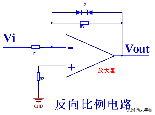 如下图是反向比例电路,输入信号加入反相输入端,对于理想运放,该电路的输出电压与输入电压之间的关系为Vout=-R3/R1*Vin。为了防止放大器输出电压超过限定值,可增加稳压管限幅,使输出的电压峰值被限制在稳压管的稳定电压值上。