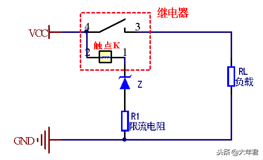 过压有过高电压和低电压保护,如图是低压保护电路,避免负载长时间处于低压状态而端断开电路,它利用的是稳压二极管的击穿电压,一旦电源电压VCC超过稳压管击穿电压时,那么稳压管就会导通,这时候触点K吸合,继电器接通,负载RL工作。当VCC电压过低(没有达到稳压管稳定电压值)时,触点不动作,继电器不会吸合。
