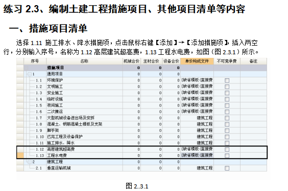 练习3:编制土建工程措施项目、其他项目清单等内容