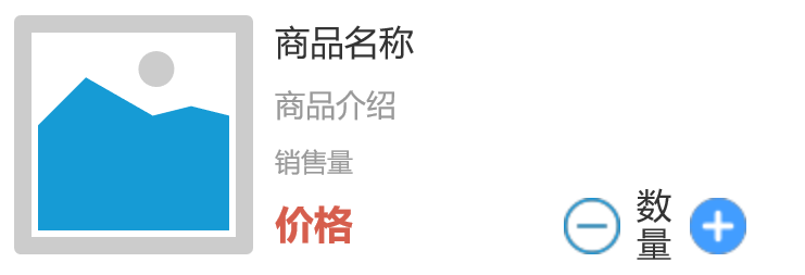 中继器内原件摆放:将商品名称、商品介绍、销售量、价格、数量、图片、加号按钮和减号按钮按下图所示摆放。