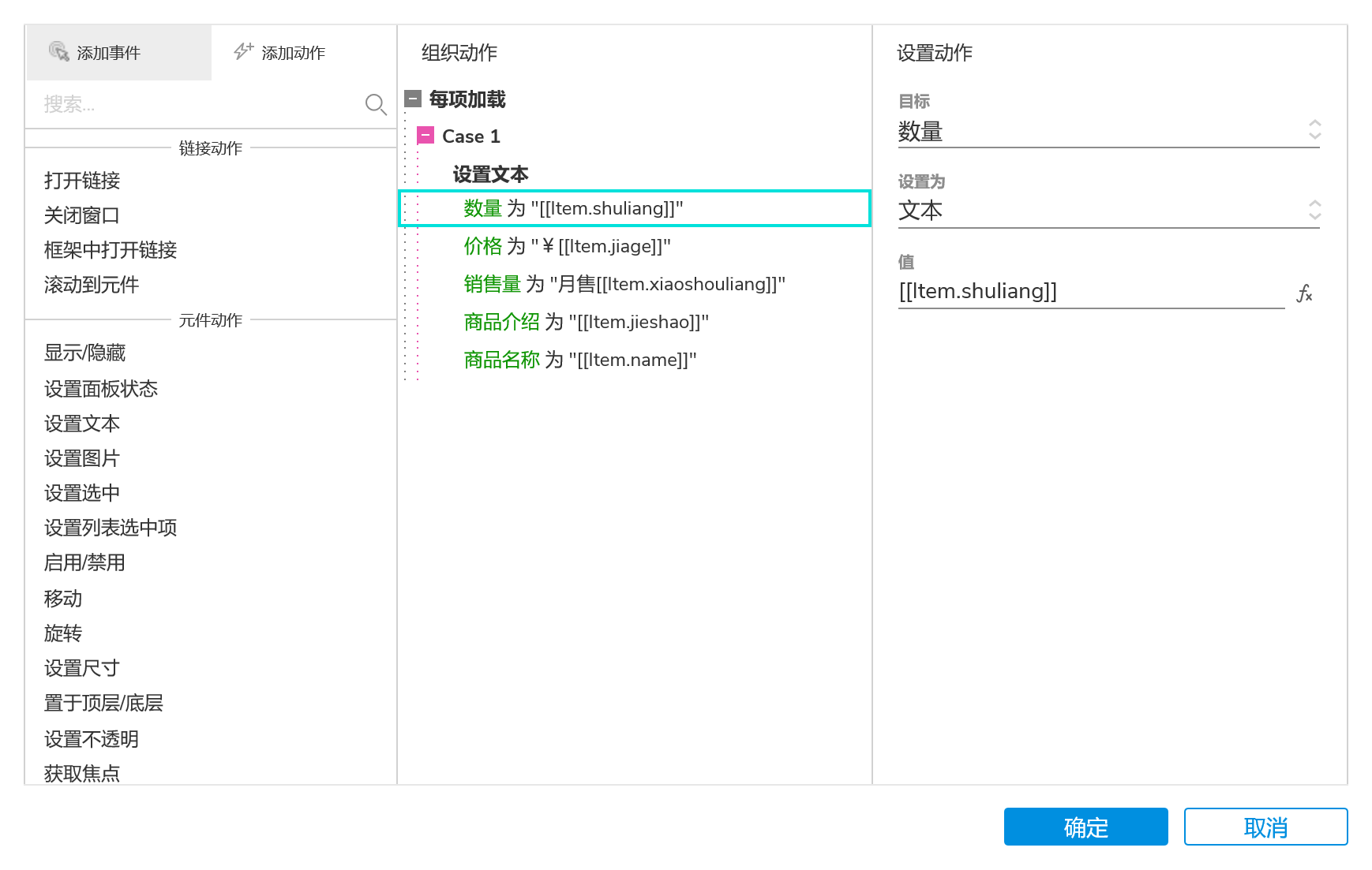 设置中继器内文本:在中继器每项加载时,把中继器表格内对应的数据,设置到对应的文本里,这里用设置文本的事件,让数量文本=[[Item.shuliang]];价格文本=¥[[Item.jiage]],销售量文本=月售[[Item.xiaoshouliang]],商品介绍文本=[[Item.jieshao]],商品名称文本=[[Item.name]]。