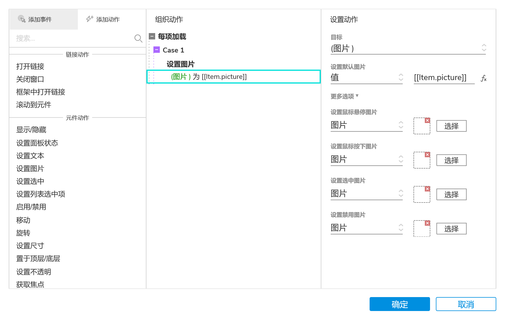 设置中继器内图片:设置好文本后,我们就要设置商品图片,这里用设置图片的交互来完成,设置图片的值为[[Item.picture]]。