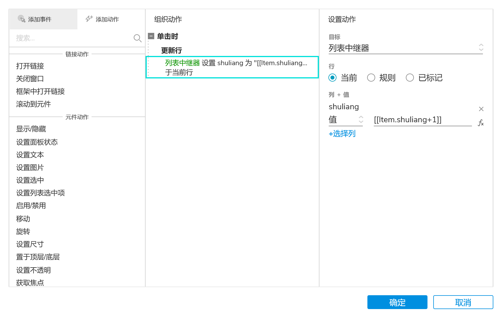 这里我们更新当前行,如果是加号按钮,更新行为[[Item.shuliang+1]];减号按钮则为[[Item.shuliang-1]]。