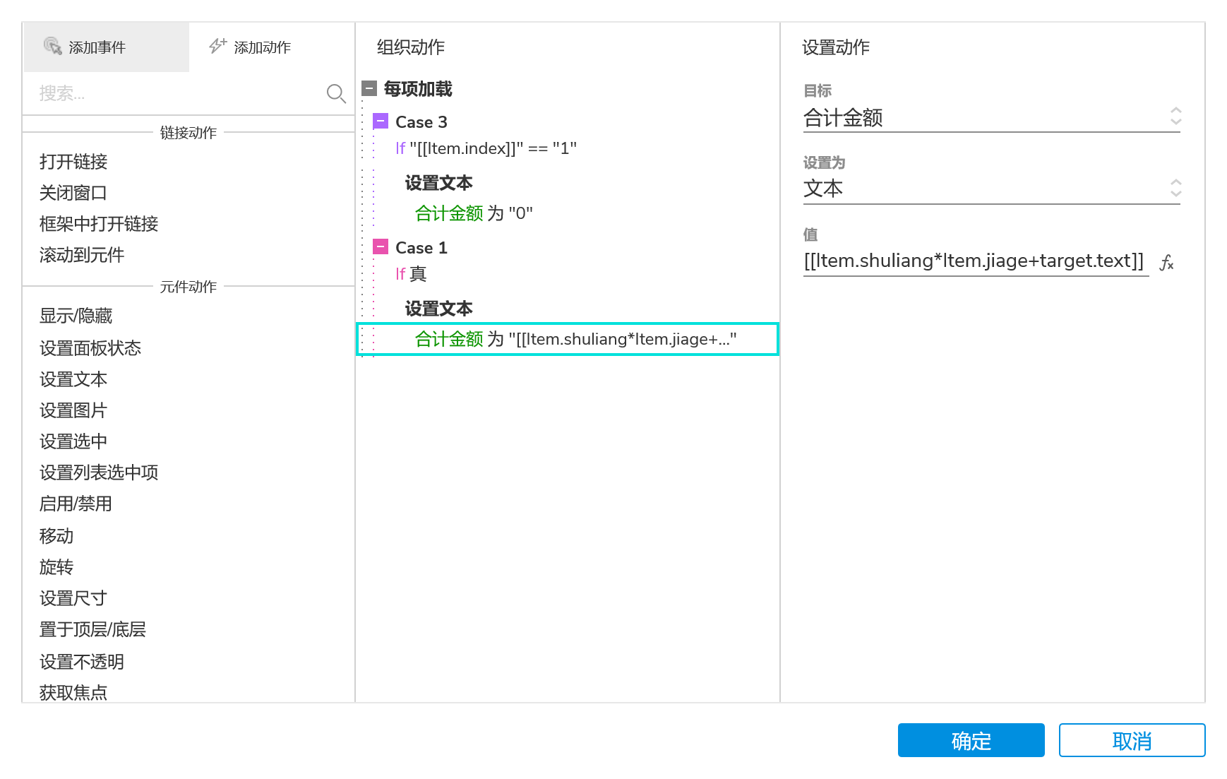 设置合计金额时间:在中继器每项加载时,我们需要判断,如果是第一行的话我们先要设置合计金额为0元,然后每一行加载的时候,我们计算合计金额的值为合计金额原来的值(target.text)+该行的价格(item.jiage)*数量(item.shuliang),这样就可以计算出总额的值。
