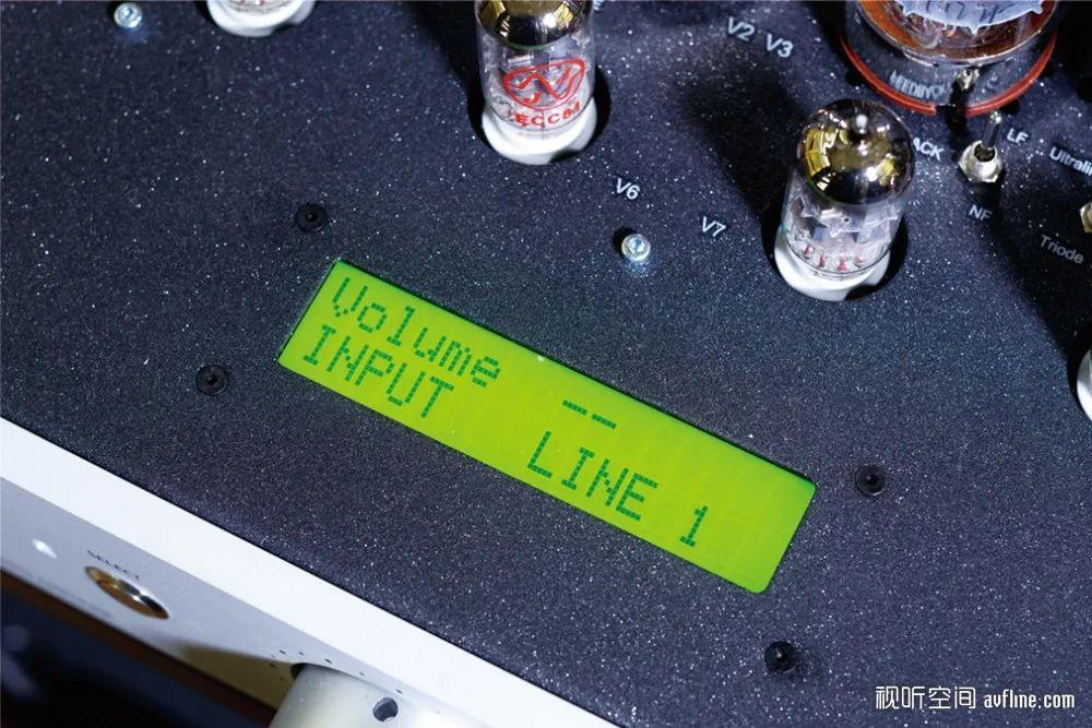 Aeolos Plus顶部还配置了绿色的液晶显示屏,除了显示音量和输入的音源之外,还可以显示各个功放管的工作状态