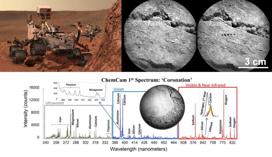 △好奇号化学相机(ChemCam)工作示意图(左);化学相机的LIBS探测前后对比,可见激光烧蚀痕迹(右);2012年8月19日,好奇号化学相机在首个目标中探测到的化学成分,这块拳头大小的石头被取名为“Coronation”(下)。来源:NASA/JPL-Caltech